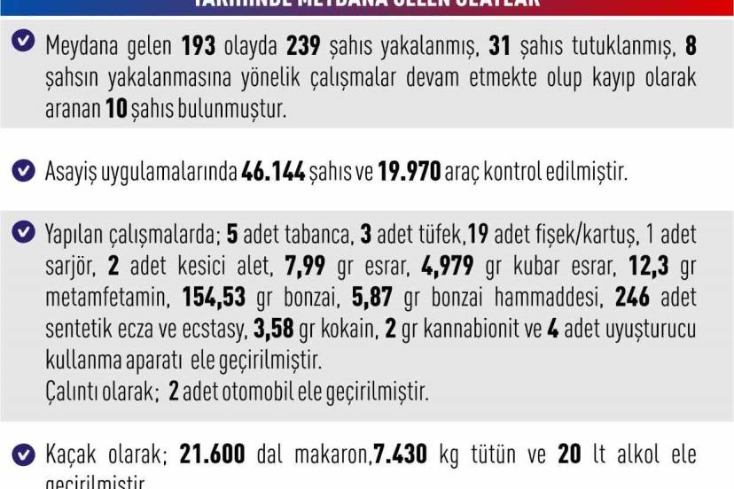 Yapılan çalışmalarda; 5 adet tabanca, 3 adet tüfek, 19 adet fişek/kartuş, 1 adet sarjör, 2 adet kesici alet, 7,99 gram esrar, 4,979 gram kubar esrar, 12,3 gram metamfetamin, 154,53 gram bonzai, 5,87 gram bonzai hammaddesi, 246 adet sentetik ecza ve ecstasy, 3,58 gram kokain, 2 gram kannabionit ve 4 adet uyuşturucu kullanma aparatı, çalıntı olarak 2 adet otomobil, kaçak olarak ise 21 bin 600 dal makaron, 7 bin 430 kilo tütün ve 20 litre alkol ele geçirildiği bildirildi.