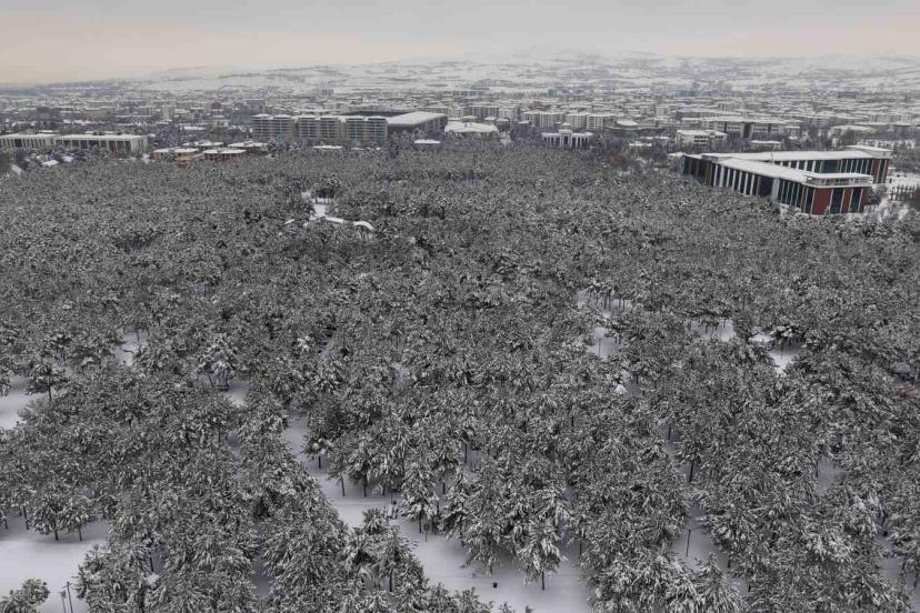 Elazığ’da kar yağışı sonrası şehrin kalbindeki Fırat Üniversitesi ormanı ve Kültür Park, binaların arasında yükselen beyaz bir vahaya dönüştü.
