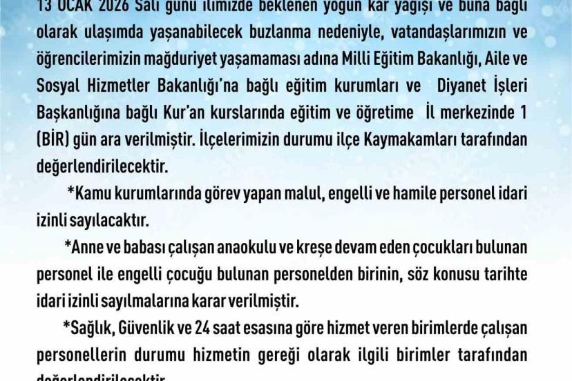 Elazığ Valiliği’nden yapılan açıklamada, "13 Ocak 2026 Salı günü ilimizde beklenen yoğun kar yağışı ve buna bağlı olarak ulaşımda yaşanabilecek buzlanma nedeniyle, vatandaşlarımızın ve öğrencilerimizin mağduriyet yaşamaması adına Milli Eğitim Bakanlığı, Aile ve Sosyal Hizmetler Bakanlığı’na bağlı eğitim kurumları ve Diyanet İşleri Başkanlığı’na bağlı Kur’an kurslarında eğitim ve öğretime il merkezinde 1 gün ara verilmiştir. İlçelerimizin durumu ilçe Kaymakamları tarafından değerlendirilecektir. Kamu kurumlarında görev yapan malul, engelli ve hamile personel idari izinli sayılacaktır. Anne ve babası çalışan anaokulu ve kre?e devam eden çocukları bulunan personel ile engelli çocuğu bulunan personelden birinin, söz konusu tarihte idari izinli sayılmalarına karar verilmiştir. Sağlık, güvenlik ve 24 saat esasına göre hizmet veren birimlerde çalışan personellerin durumu hizmetin gereği olarak ilgili birimler tarafından değerlendirilecektir" denildi.