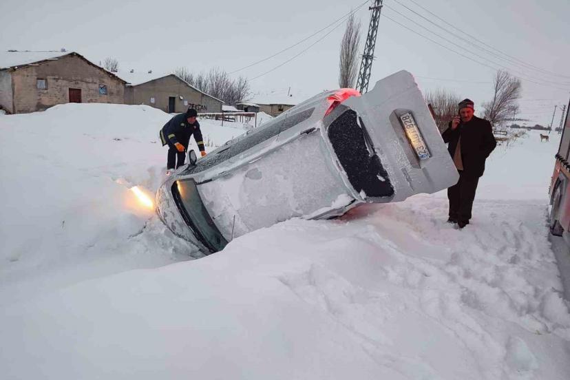 Elazığ’ın Karakoçan ilçesinde kar yağışı ve buzlanmayla birlikte kayan hafif ticari araç, yol kenarındaki kanala devrildi.