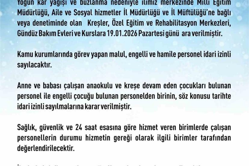 Elazığ Valiliği’nden yapılan açıklamada, "Yoğun kar yağışı ve buzlanma nedeniyle ilimiz merkezinde Milli Eğitim Müdürlüğü, Aile ve Sosyal hizmetler İl Müdürlüğü ve İl Müftülüğü’ne bağlı veya denetiminde olan kreşler, özel eğitim ve rehabilitasyon merkezleri, gündüz bakım evleri ve kurslara Pazartesi günü ara verilmiştir. Kamu kurumlarında görev yapan malul, engelli ve hamile personel idari izinli sayılacaktır. Anne ve babası çalışan anaokulu ve kreşe devam eden çocukları bulunan personel ile engelli çocuğu bulunan personelden birinin, söz konusu tarihte idari izinli sayılmalarına karar verilmiştir. Sağlık, güvenlik ve 24 saat esasına göre hizmet veren birimlerde çalışan personellerin durumu hizmetin gereği olarak ilgili birimler tarafından değerlendirilecek. İlçelerde ise Kaymakamlar tarafından karar verilecektir" denildi.