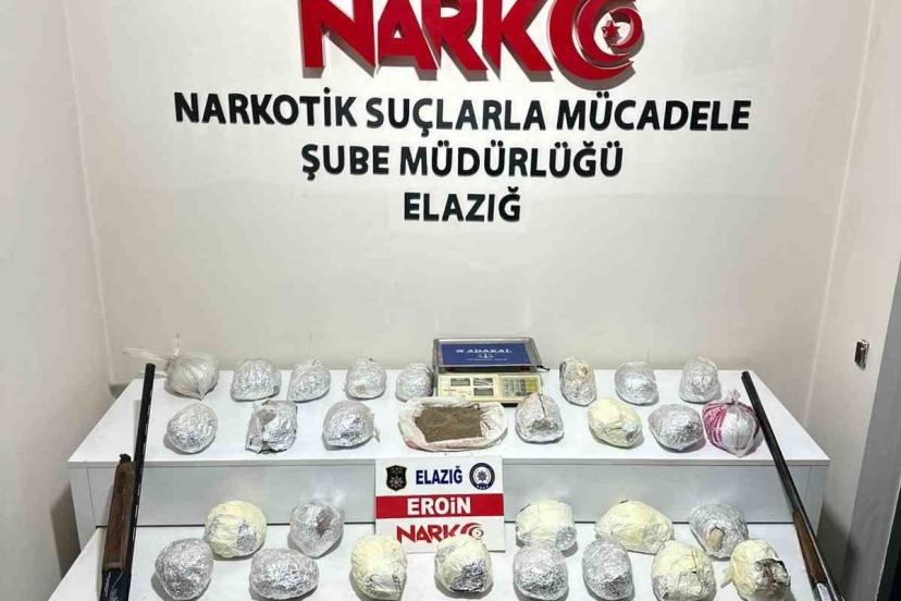 Elazığ Cumhuriyet Başsavcılığı koordinesinde İl Emniyet Müdürlüğü Narkotik Suçlarla Mücadele Şube Müdürlüğü ekipleri, uyuşturucuyla mücadele çalışmalarını aralıksız sürdürüyor. Ekipler, batı illerine yüklü miktarda uyuşturucu madde sevk edileceği bilgisine ulaştı. Bu kapsamda 2 adrese düzenlenen operasyonda, 29 parça halinde 30 kilo 800 gram eroin, 5 parça halinde toplam 44 gram metamfetamin, 4 adet ruhsatsız tabanca ve tabancalara ait 183 adet fişek, 2 adet ruhsatsız tüfek, 2 adet hassas terazi ile uyuşturucudan elde edildiği değerlendirilen 19 bin 500 euro ve 10 bin TL ele geçirildi.