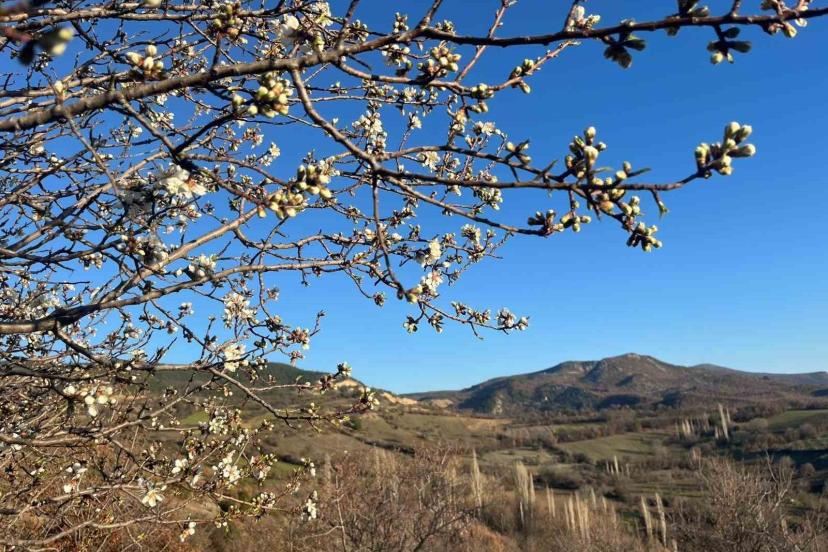 Kütahya’nın Emet ilçesine bağlı Sülye köyünde, hava sıcaklıklarının mevsim normallerinin üzerinde seyretmesiyle birlikte badem ağaçları çiçek açtı.