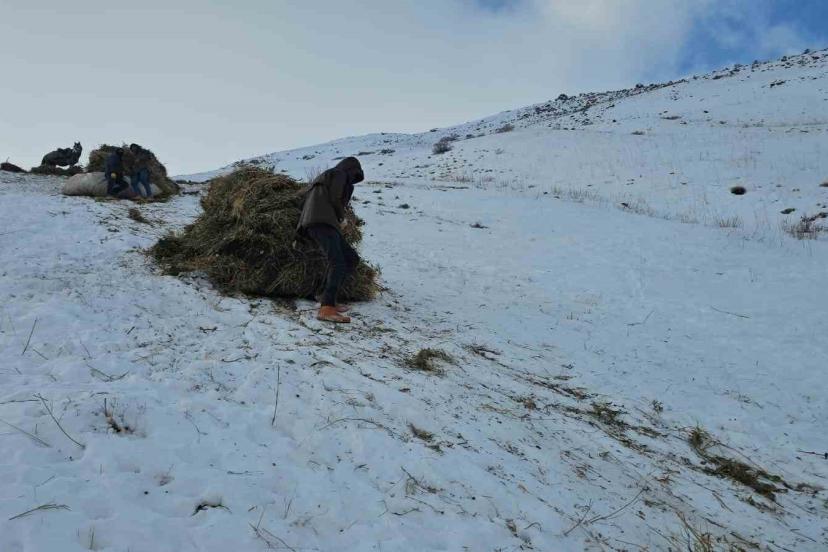 Van’ın Erciş ilçesinde köylüler, yazın biçilen otları kışın yağan karla birlikte kızaklarla köye indirerek hayvanlarının kışlık yem ihtiyacını karşılıyor.