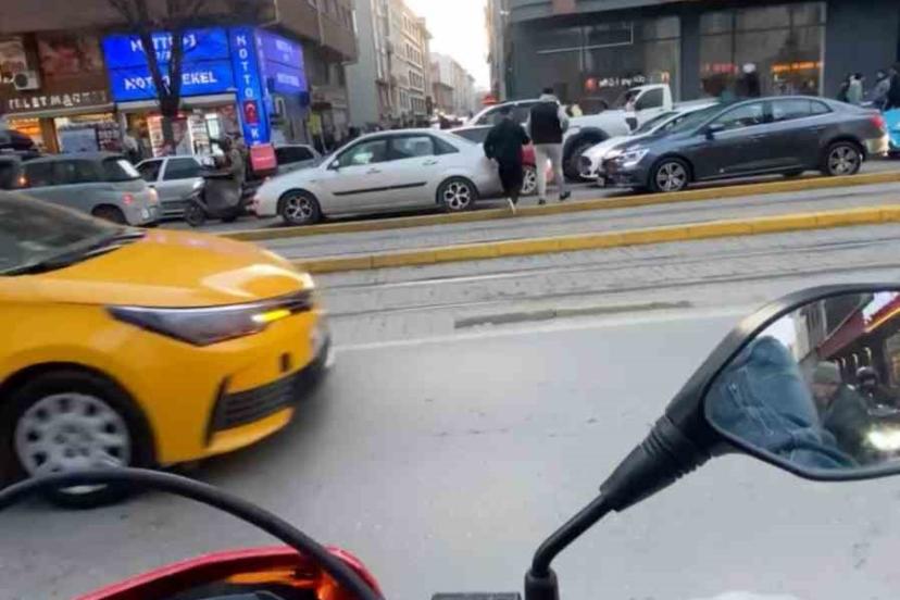 Eskişehir’de bir motosiklet sürücüsü, trafiğe takılmamak için tramvay yolu üzerinde bulunan banketleri aşarak karşı sokağa geçti.