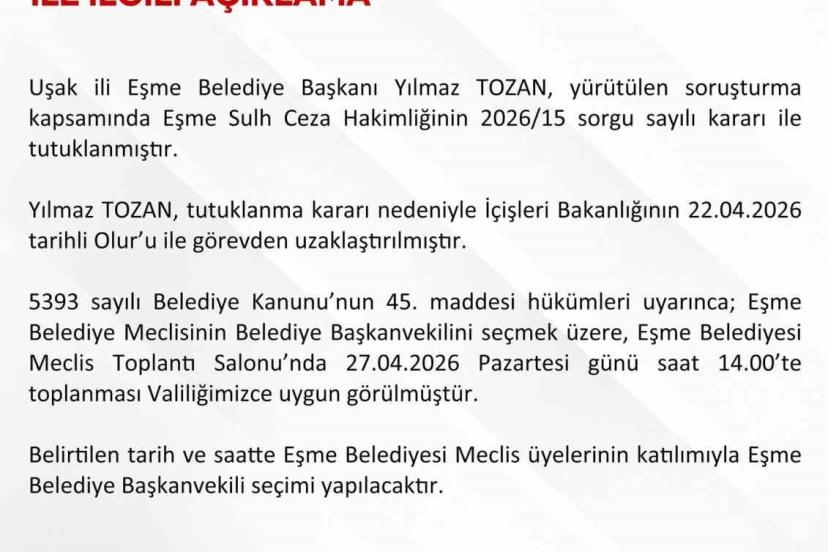 Uşak Valiliğince yapılan açıklamaya göre; "Uşak ili Eşme Belediye Başkanı Yılmaz Tozan, yürütülen soruşturma kapsamında Eşme Sulh Ceza Hakimliğinin 2026/15 sorgu sayılı kararı ile tutuklanmıştır. Yılmaz Tozan, tutuklanma kararı nedeniyle İçişleri Bakanlığının 22 Nisan 2026 tarihli Olur’u ile görevden uzaklaştırılmıştır. 5393 sayılı Belediye Kanunu’nun 45. maddesi hükümleri uyarınca; Eşme Belediye Meclisinin Belediye Başkanvekilini seçmek üzere, Eşme Belediyesi Meclis Toplantı Salonu’nda 27 Nisan 2026 Pazartesi günü saat 14.00’te toplanması Valiliğimizce uygun görülmüştür. Belirtilen tarih ve saatte Eşme Belediyesi Meclis üyelerinin katılımıyla Eşme Belediye Başkanvekili seçimi yapılacaktır." ifadelerine yer verildi.