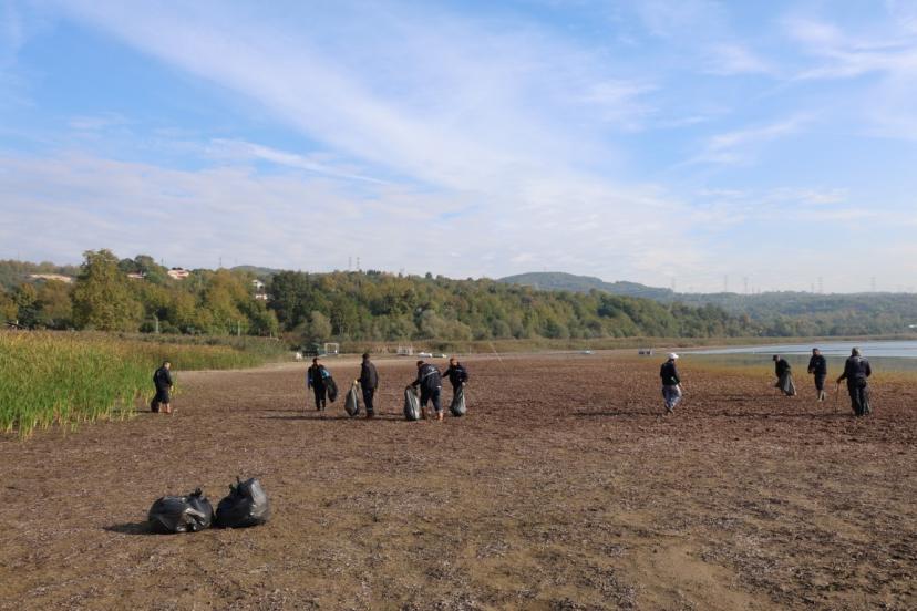 Kartepe’de bulunan Eşme Sahili’nde Sapanca Gölü’nün su seviyesinin düşmesiyle ortaya çıkan atıklar temizlendi.