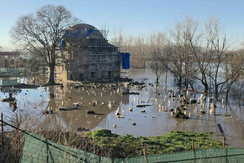 Edirne’de son günlerde etkili olan yağışların ardından Tunca Nehri’nde su seviyesi yükseldi. Artan debi nedeniyle Evliya Kasım Paşa Camii restorasyon şantiyesinin bir bölümü sular altında kaldı.