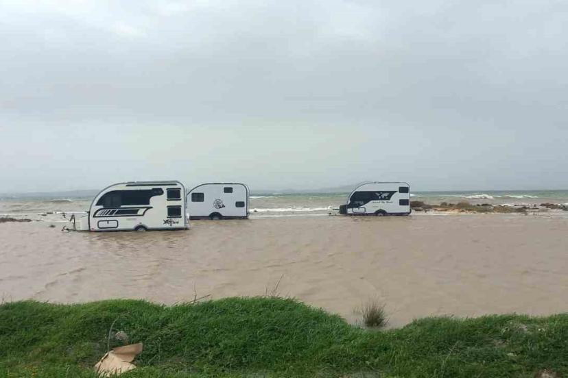 Çanakkale’de etkili olan fırtına nedeniyle Ezine ilçesinde deniz kara ile birleşirken, bölgede bulunan karavanlar su altında kaldı.