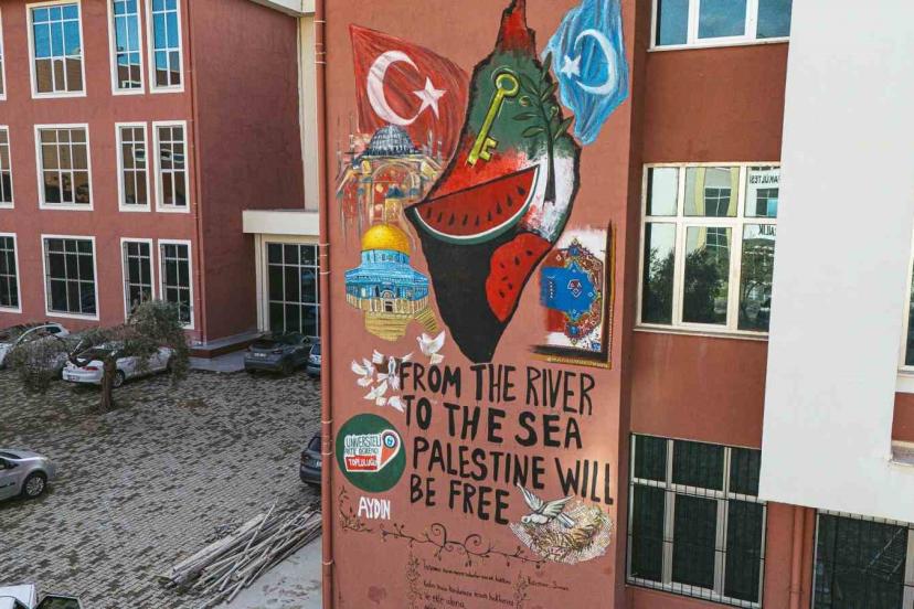 Aydın Adnan Menderes Üniversitesi’nde öğrenciler, Gazze’ye yönelik saldırıları protesto etmek ve Filistin halkına destek vermek amacıyla kampüs duvarlarında mural (duvar resmi) çalışması gerçekleştirdi.