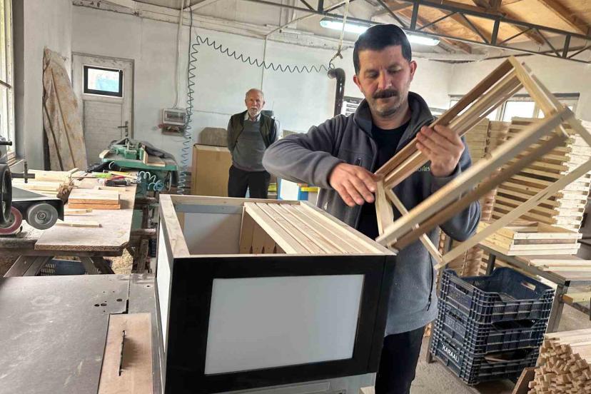 "Sandviç panelli kovanlarımız ısı yatılımı sağlıyor. Polen tuzaklı kovan bunlar. Bu kovanlarda rutubet ve nem terleme oranı çok daha düşük. Sandviç paneller çevre dostu bir malzemeden yapılıyor. Diğer kovanlar genellikle çam ağacından yapıldığı için ağır oluyorlar. Biz ithal Sibirya ladini kullanıyoruz. Bunlar daha hafif oluyor. Çerçevede bile bu ladinlerden kullanıyoruz."