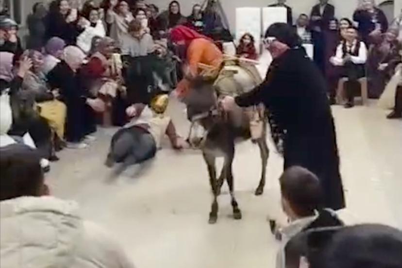 Manisa’nın Gördes ilçesine bağlı Beğenler Mahallesi’nde Birkan ve Tuğba Çoban çiftinin kına gecesinde damadın arkadaşları ilginç bir sürpriz yapmak istedi. Damadın arkadaşı Halil Çetin, eşeğe binerek kına gecesinin gerçekleştirildiği kapalı salona girdi. Misafirlerin arasında eşekle gezen Halil Çetin, şov yapmak istediği sırada misafirlerin üzerine doğru düştü. Renkli görüntülere sahne olan ‘damat eğlencesinde’ misafirler kahkahaya boğulurken eşekten düşen Halil Çetin olayı yara almadan atlattı.