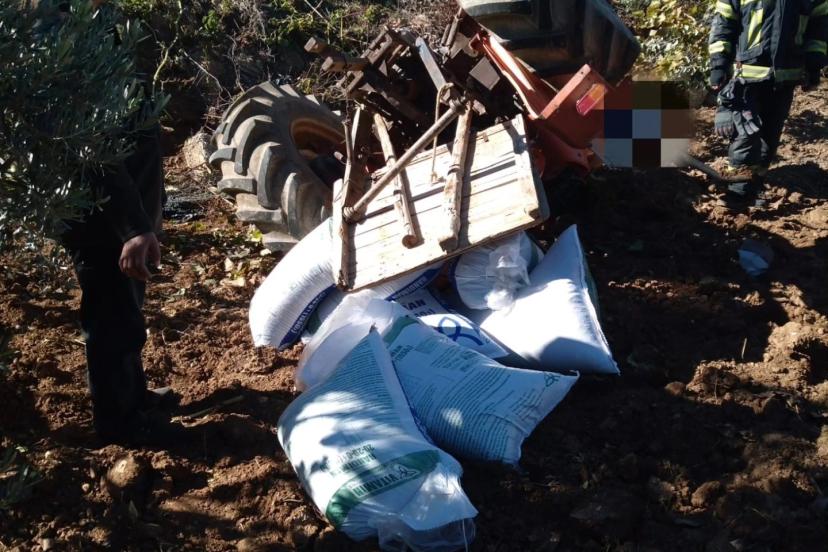 Gübre taşıyan traktör devrildi, sürücü altında kaldı