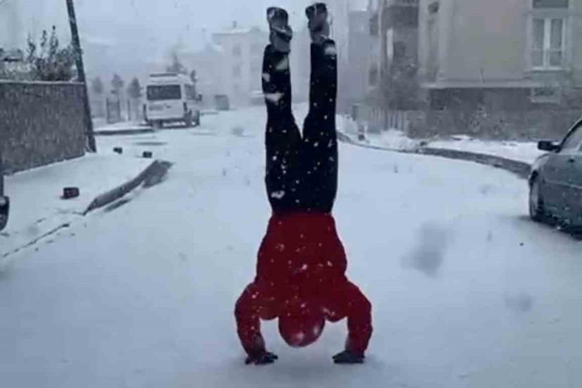 Samsun’un Terme ilçesinde yaşayan ve geri takla rekoruyla Guinness Rekorlar Kitabı’na giren Osman Ismak, ilçede etkili olan kar yağışının sevincini 20 geri takla atarak kutladı.