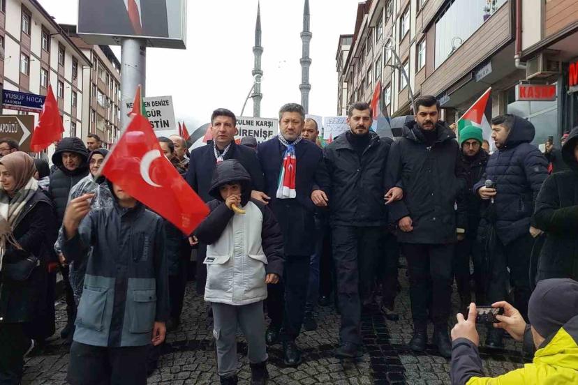 Rize’nin Güneysu ilçesinde, Galata Köprüsü’nde gerçekleşen "Sinmiyoruz, susmuyoruz Filistin’i unutmuyoruz" sloganlı yürüyüşe destek yürüyüşü düzenlendi.