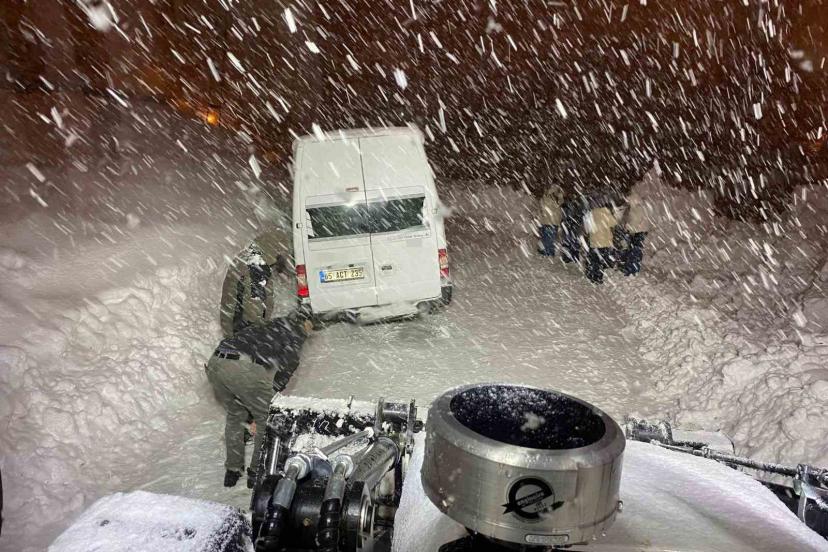 Hakkari’de kar ve tipi nedeniyle mahsur kalan yolcu minibüsü, belediye ekipleri tarafından kurtarıldı.