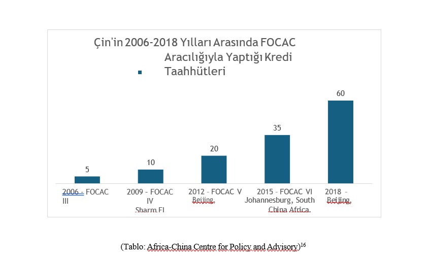 Bu doğrultuda, tabloda da görülebileceği üzere Çin Halk Cumhuriyeti, FOCAC’ın üçüncü toplantısından itibaren Afrika ülkelerine yönelik altyapı projeleri, tarımsal verimliliğin artırılması, sanayileşme, sağlık hizmetleri ve borç hafifletme gibi somut alanlarda verdiği kredi taahhütlerini istikrarlı bir şekilde artırmıştır.
