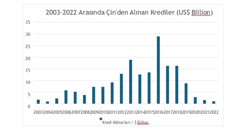 Tabloda da görüldüğü üzere, Çin’in Afrika’ya sağladığı krediler 2003 yılından itibaren düzenli bir şekilde artış göstermiş, özellikle 2013 yılında Kuşak ve Yol Girişimi’nin ilan edilmesinin ardından bu artış daha da belirgin hale gelmiştir. Bu durum, Çin’in Afrika kıtasında ekonomik ve siyasi olarak güçlü bir konum kazandığına işaret ederken, bazı çevrelerde Çin’in Afrikalı ülkelere geri ödemekte zorlanacakları ölçüde borç vererek stratejik nüfuz kazandığı yönünde tartışmalara yol açmıştır. Bu iddialar literatürde “Borç Tuzağı Diplomasisi” olarak adlandırılmaktadır.