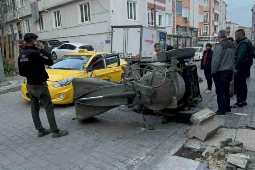 Tekirdağ’ın Çorlu ilçesinde ticari taksinin yol verdiği panelvan minibüsün arkasında takılı harç karma makinesi, taksinin üzerine devrildi. Taksi şoförü kazayı hafif sıyrıklarla atlattı.