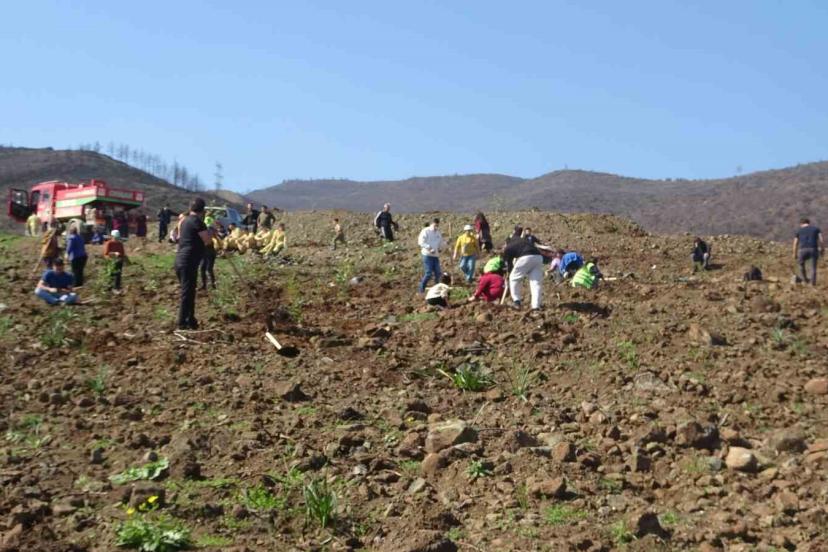 Hatay’da Orman Genel Müdürlüğü ile doğaseverlerin işbirliğinde orman yangınından dolayı yanan alanları canlandırmak için düzenlenen etkinlikte 5 bin fidan toprakla buluşturuldu.