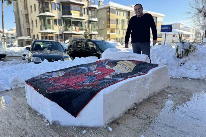 Doğangönül, kardan yatağın üzerine battaniye de örterken yaptığı yatak dükkana gelen misafirlerinin de ilgisini çekiyor.