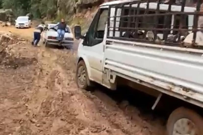 Heyelan sonrası yol çamura bulandı, offroad yarışlarını aratmayan görüntüler ortaya çıktı