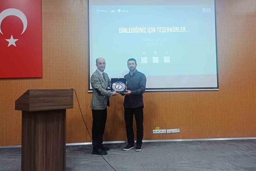 Programın sonunda İlçe Milli Eğitim Müdürü Hasan Kilitci tarafından Dr. Öğretim Üyesi Ekrem Tunca’ya katkılarından dolayı teşekkür belgesi ve plaket takdim edildi.