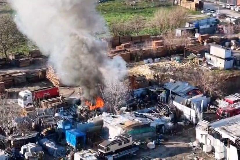 Bursa’nın İnegöl ilçesinde faaliyet gösteren bir geri dönüşüm (hurdacı) tesisinde yangın çıktı. Yangın havadan görüntülendi.