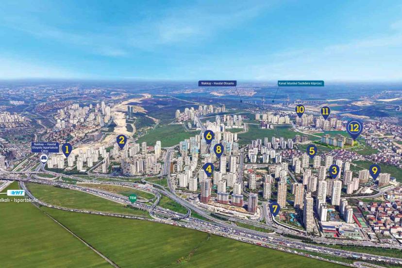 Yüksek yatırım potansiyeli ve aile yaşamına uygun yapısıyla öne çıkan Ispartakule’de konumlanan Bizim Evler 12; geniş peyzaj alanları, ferah konut seçenekleri, tüm ihtiyaçlara yanıt verecek ticari üniteleri, ulaşım avantajları ve eşsiz manzarasıyla dikkat çekiyor. Proje, yapımı hızla devam eden Hasdal - Nakkaş Otoyolu ve TEM Otoyolu Ispartakule gişelerine yalnızca 3 dakika mesafede yer alırken, panoramik Küçükçekmece Gölü manzarasıyla öne çıkıyor. İstanbul Havalimanı ve Yavuz Sultan Selim Köprüsü’ne hızlı ulaşım sağlayan bağlantı yollarının hemen yanı başında bulunan Bizim Evler 12, hem yatırım hem de lokasyon avantajı açısından cazip fırsatlar sunuyor. Türkiye’nin en büyük şehir hastanesi "Çam Sakura" başta olmak üzere eğitim ve sağlık kurumlarına yakın mesafede konumlanan proje, tüm ihtiyaçlara yanıt verecek ticari üniteleriyle bütüncül bir yaşam alanı sunuyor.