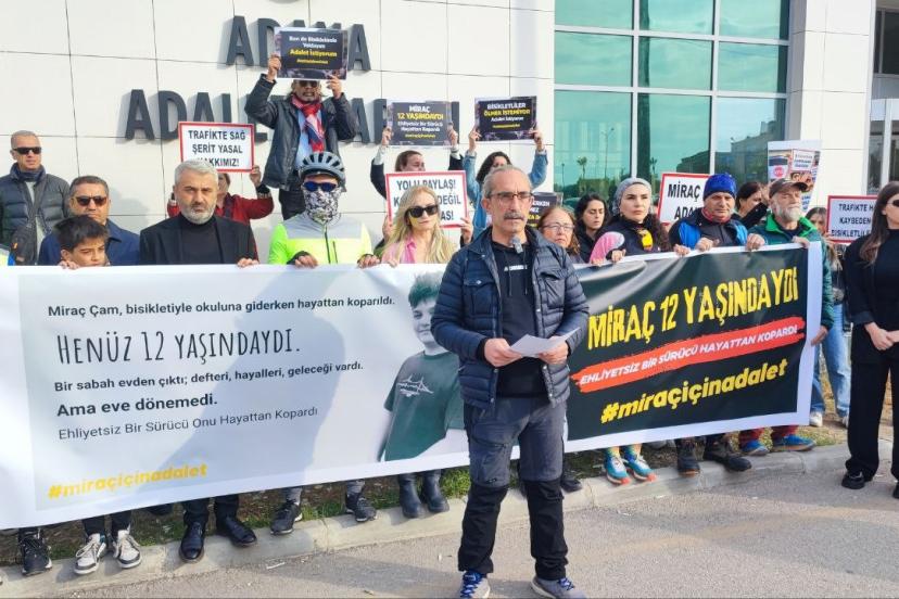 Bisikletli gruplar bugün duruşma öncesi Adana Adliyesi önünde toplanarak Miraç’ın ailesine destek verdi. Adliye önünde pankart açan bisikletli grup sloganlar attı. Bisikletli grup adına konuşan Kemal Yücel, "Bugün burada, bir çocuğun yarım kalan hayatı için toplandık. Bugün burada, bir çocuk okula giderken ölmemeli demek için bir aradayız. Biz bugün yalnızca Miraç’ı anmıyoruz. Biz bugün, trafikte her gün görmezden gelinen bisikletliler için, okul yolunda yaşamını yitiren çocuklar için, ’kaza’ denilerek üzeri örtülen ihmaller için buradayız" dedi.