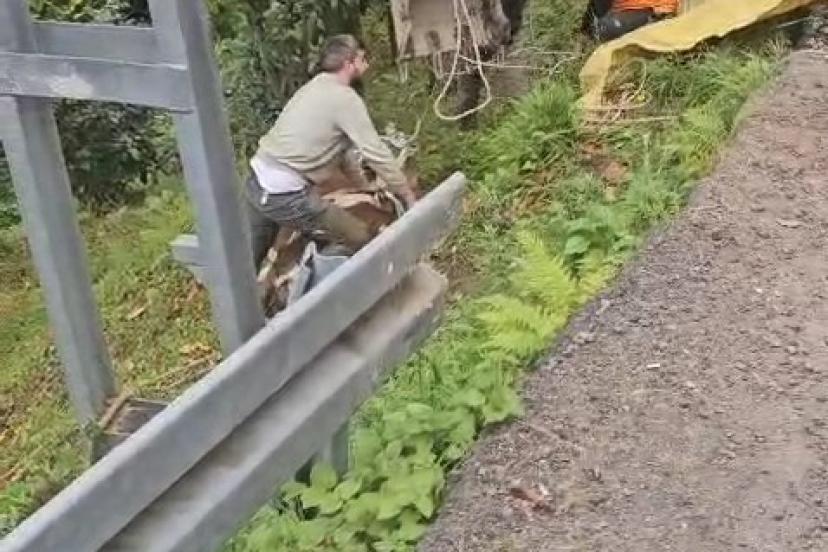 Maselevat Şelalesi’ni görmeye getiren Çamlıhemşin Doğa Sporları Kulübü Başkanı ve Arama Kurtarma Ekibi Üyesi Hüseyin Şahin, yoldan aşağıya yuvarlanan hayvanı ve vatandaşların mücadelesini fark etti. Arama kurtarma eğitimlerinden edindiği bilgi ve tecrübelerini kullanan Şahin’in de desteği ile inek vinç yardımıyla kısa sürede sağ salim bulunduğu yerden çıkarıldı. İnek yola çıkarılıp araca yüklenerek sahiplerine teslim edildi.