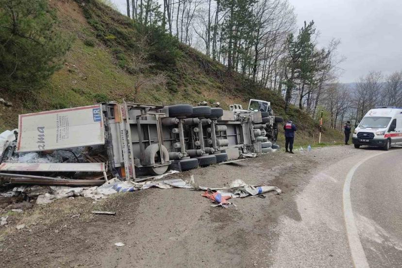 İnegöl’de su yüklü tır yamaca devrildi: 1 yaralı