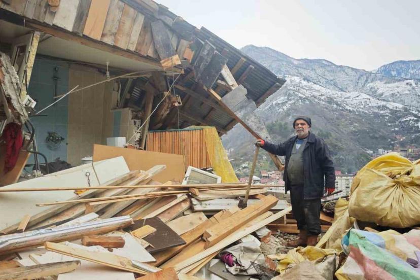 Artvin’in Borçka ilçesinde yoğun kar yağışının ardından meydana gelen toprak kayması sonucu bir ev ile bitişiğindeki ahır tamamen yıkıldı. Heyelanda, Hamit Navdar’a ait ev ve ahır kullanılamaz hale gelirken, Navdar’ın hayvanlarına ot vermek için geldiği ahırda heyelandan son anda kurtulduğu ortaya çıktı.