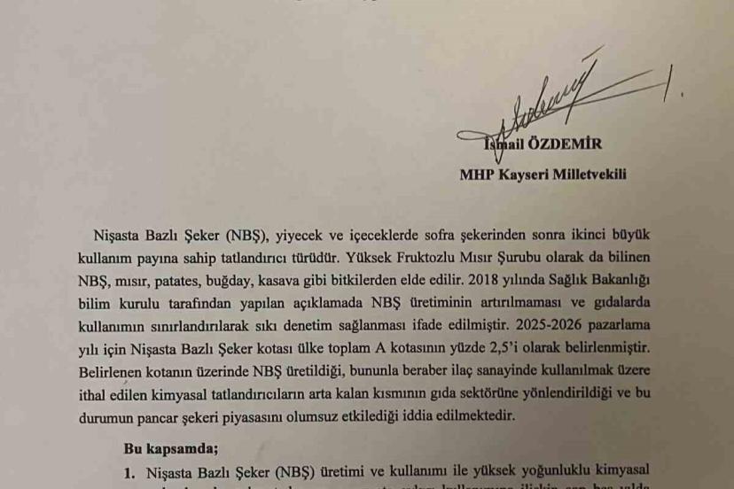 Milliyetçi Hareket Partisi (MHP) Genel Başkan Yardımcısı ve Kayseri Milletvekili İsmail Özdemir, Türkiye Büyük Millet Meclisi’ne (TBMM) şeker fabrikalarının pancar ve şeker üretimiyle ilgili yaşadığı sorunlarla ilgili soru önergesi verdi.