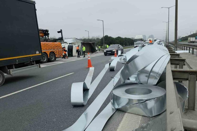 Edinilen bilgilere göre, sürücülüğünü Ferhat Omaç’ın yaptığı sac yüklü kamyon, TEM Otoyolu Hadımköy bağlantı yolundaki virajı döndüğü sırada kontrolden çıkarak yan yattı. Araçta bulunan rulo halindeki saclar yola savrulurken, otoyolda ulaşım tamamen durdu.