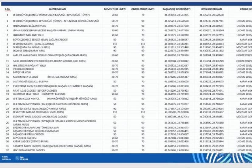 D100 Karayolu Büyükçekmece TÜYAP ile Altunizade Köprülü Kavşağı arasında saatte 80 kilometre olan hız limiti 90 kilometreye çıkarıldı. Beşiktaş Barbaros Bulvarı’nda maksimum hız limiti ise saatte 70 kilometre olarak değişirken, Hasdal-Okmeydanı Bağlantı Yolu’nun yeni hız limiti saatte 90 kilometre, O-3 TEM Ayrımı-Basın Ekspress Yolu’ndaki yeni limit saatte 100 kilometre olarak güncellendi. 4. Levent-TEM Bağlantı Yolu’nun yeni hız sınırı saatte 90 kilometre olurken, O3 Tem Ayrımı - Basın Ekspress yolu - (Mahmutbey Batı Kavşağı- Atatürk Havaalanı Kavşağı - Havaalanı Caddesi) saatte 110 kilometreye çıkarıldı. D100 Harem - Tuzla arası saatte 90 kilometreye, Söğütlüçeşme Köprülü Kavşağı - Uzunçayır Köprülü Kavşağı Arası saatte 90 kilometreye çıkarıldı. Bolluca - İhsaniye Yolu, Tantavi, Vecdi Diker ve Halit Ulukurt Tüneli ise saatte 90 kilometreye çıkarıldı. Kağıthane Anadolu Caddesi saatte 50 kilometreden 70 kilometre, Arnavutköy - Habipler Yolu (Sultangazi - Fenertepe Arası), Hal Otogar Bağlantı Yolu ve Haramidere Bağlantı yolu saatte 90 kilometre olarak güncellendi.