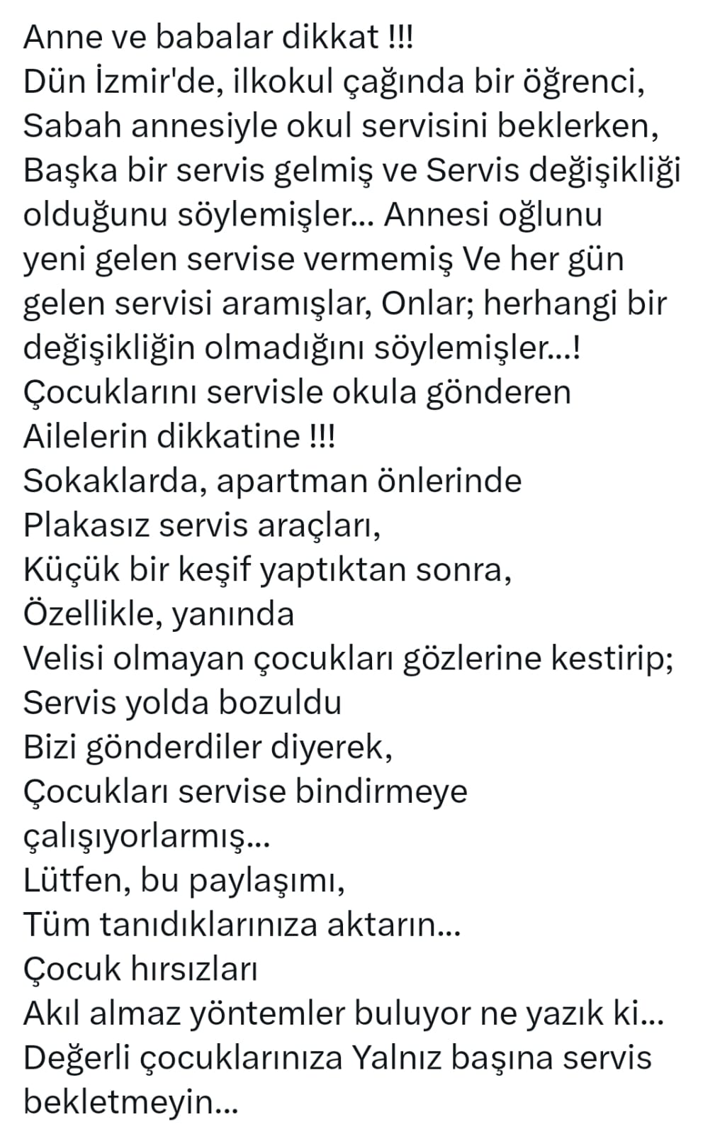Velilere göre benzer durumların farklı noktalarda yaşandığı, özellikle plakasız araçların çocukları servise bindirmeye çalıştığı yönünde iddialar bulunuyor. “Yolda arıza oldu, başka araç gönderildi” gibi açıklamalarla çocukların araçlara bindirilmeye çalışıldığı öne sürülüyor.