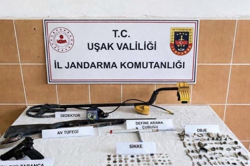 Uşak İl Jandarma Komutanlığınca, kaçakçılık olaylarını önlemek amacıyla yürütülen çalışmalar kapsamında, Ulubey ilçesine bağlı Küçükkayalı köyünde ikamet eden 53 yaşındaki H.S.’nin evine operasyon düzenlendi. Adreste yapılan aramalarda, 48 adet Osmanlı dönemine ait sikke, 75 adet tarihi obje, 7 adet 7.65 mm tabanca fişeği, 1 adet dedektör, 1 adet define aramak amacıyla kullanılan metal çubuk ile 1 adet kuru sıkı tabanca ele geçirildi.