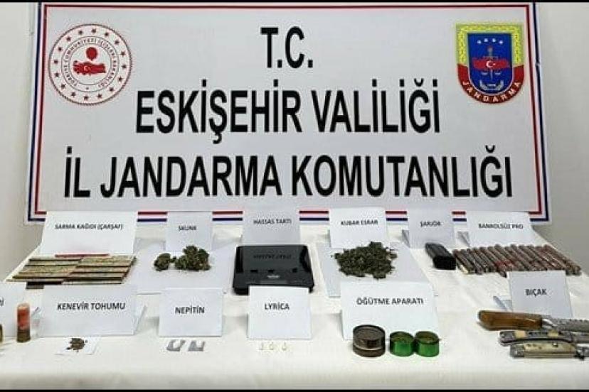 Eskişehir İl Jandarma Komutanlığı ekiplerince uyuşturucu suçları ile mücadeleye yönelik yürütülen istihbarı çalışmaları neticesinde Çifteler ilçesinde 2 şahsın araç içerisinde uyuşturucu kullandığı bilgisi alındı. Tespit edilen araçta, 2 şahsın üzerinde ve ikametlerinde yapılan aramada, 17 gram kubar esrar, 13 gram skunk, 6 gram kenevir tohumu, 1 adet hassas terazi, 5 adet sentetik ecza hap, 14 adet bandrolsüz puro, 11 adet sigara sarma kağıdı, 2 adet öğütücü aparat, 1 adet tabanca şarjörü, 20 adet tabanca fişeği, 1 adet av tüfeği fişeği ve 3 adet bıçak ele geçirildi. Olayla ilgili yakalanan 2 şüpheli şahıs hakkında, soruşturma başlatıldı.