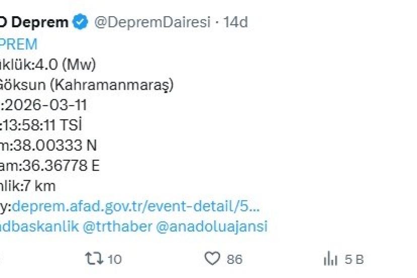 Afet ve Acil Durum Yönetimi Başkanlığı’ndan (AFAD) alınan bilgilere göre, Kahramanmaraş’ın Göksun ilçesinde saat 13.58’de 4 büyüklüğünde deprem meydana geldi. Depremin derinliği 7 kilometre olarak ölçüldü.