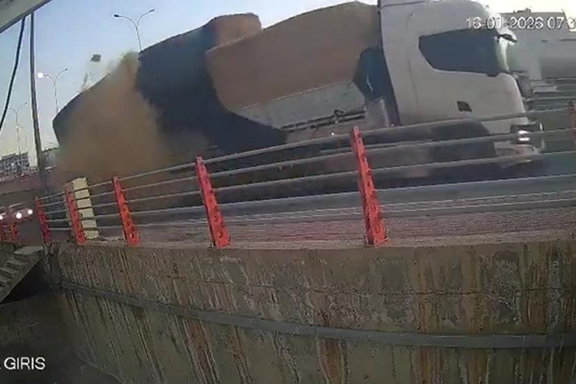 Görüntülerde, tırın seyir halindeyken saman balyasının kasadan düştüğü ve kaldırımda yürüyen kişinin panikle kaçtığı anlar yer aldı. Olayda şans eseri yaralanan olmazken, çevrede kısa süreli panik yaşandı.