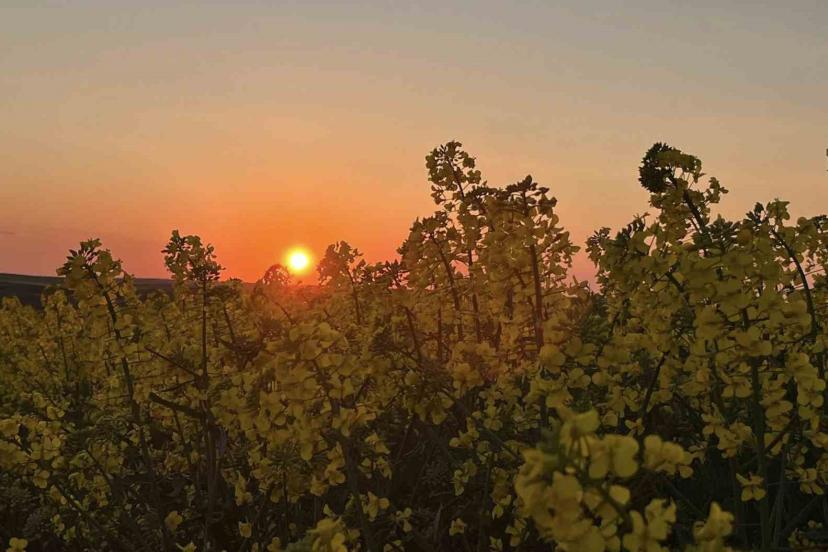 Kanola tarlalarında gün batımı manzarası