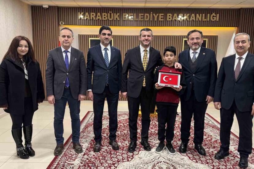 Karabük’te İstiklal Marşı okunurken kar altında saygı duruşunda bulunan Türkmenistan uyruklu 12 yaşındaki öğrenci, örnek davranışı nedeniyle Belediye Başkanı Özkan Çetinkaya tarafından ödüllendirildi.