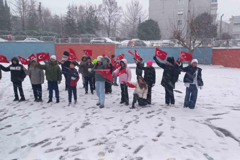Kar taneleri arasında dalgalanan bayraklar, beyaza bürünen okul bahçesinde bayrak sevgisinin sıcaklığını bir kez daha gözler önüne serdi.