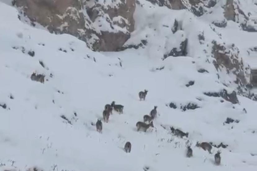 Kar üzerinde otlanan dağ keçileri sürü halinde görüntülendi