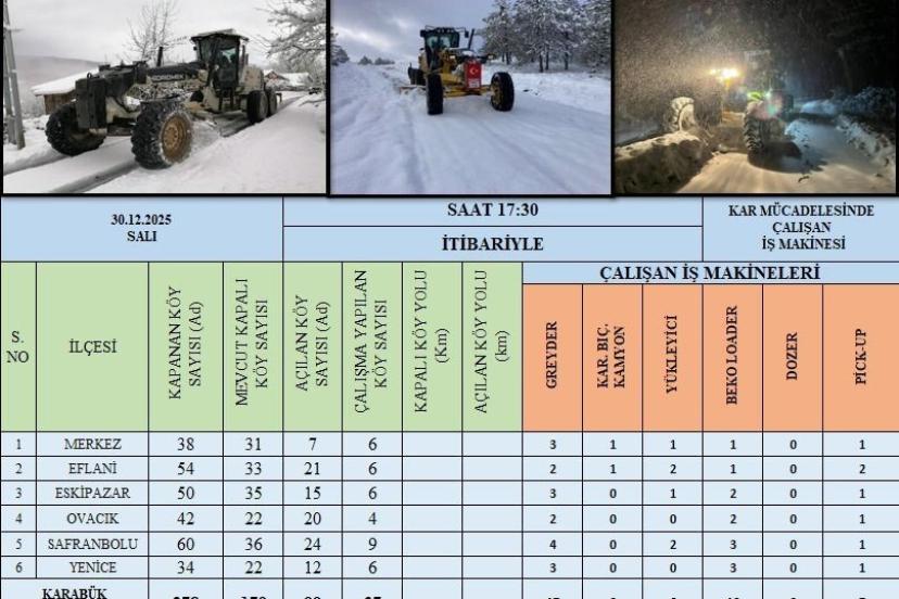 Karabük’te etkili olan yoğun kar yağışı nedeniyle kapanan köy yollarının ulaşıma açılması için Karabük İl Özel İdaresi ekipleri tarafından çalışmalar sürdürülüyor. Karabük Valiliği koordinasyonunda yürütülen karla mücadele çalışmaları kapsamında, kar küreme, yol açma, yol genişletme ve taban temizliği faaliyetleri gerçekleştirildi. Yapılan çalışmalar sonucunda il genelinde 99 köy yolu yeniden ulaşıma açıldı.