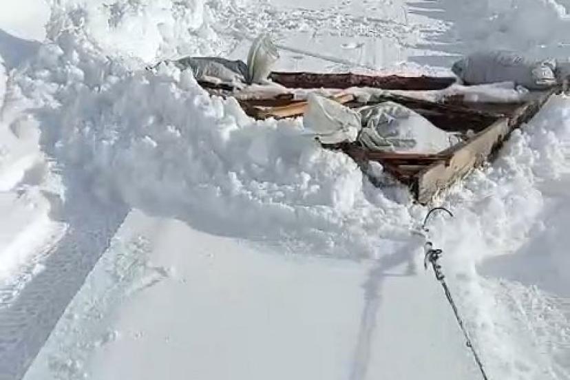 Vatandaşlar, araçlarının arkasına bağladıkları "V" yapılı ahşaptan yapılan özel aparatın üzerine ağırlık koyarak karla kaplı yolu temizlemeye başladı.