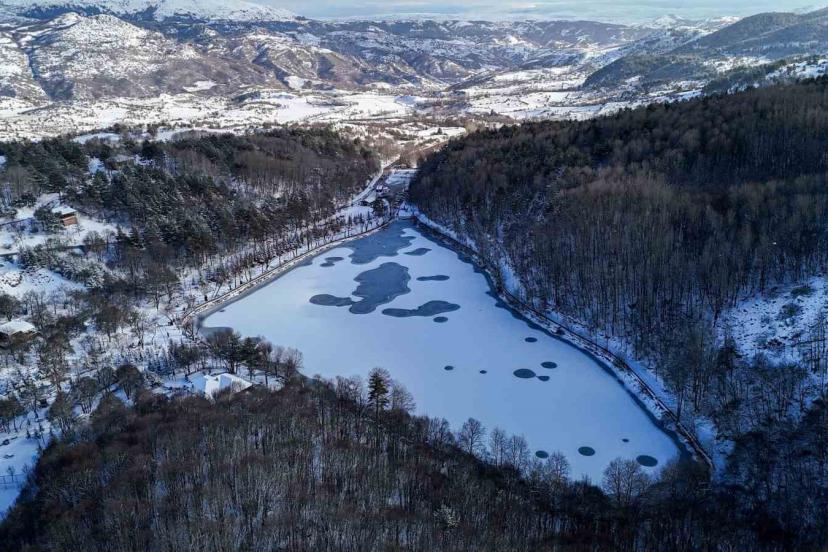 Karagöl Tabiat Parkı beyaza büründü, gölün yüzeyi buz tuttu