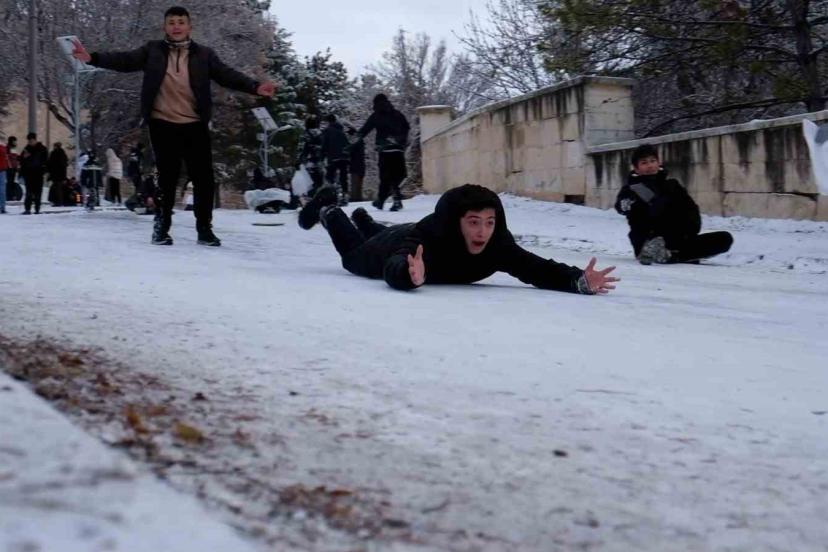 Karaman’da kar yağışı ve soğuk hava nedeniyle okulların tatil edilmesinin ardından çocuklar, karın keyfini kayarak çıkardı.