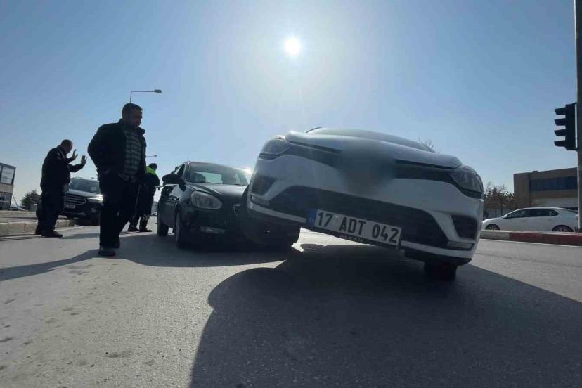 Karaman’da iki otomobilin çarpışması sonucu meydana gelen trafik kazasında, araçlardan biri diğerinin üzerine çıktı.